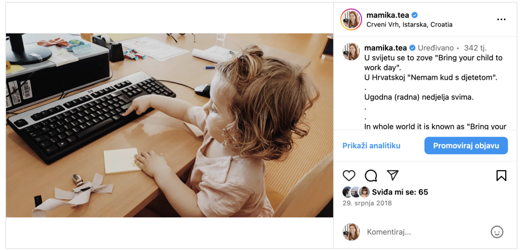 Ili recimo dobiješ vrtić i treba ti tjedan dana godišnjeg da odradiš prilagodbu djeteta na vrtić. Ali ne dobiješ godišnji jer: “nećeš moći koristiti to pravo, iako si ti pravnica u naše preduzeće, ali jebiga Tea, tebi ne cveta cveće u naše preduzeće”. Pa uzmi lažno bolovanje, jer na lijep i pošten način ne ide. Ili nosi dijete sa sobom na posao (Tea napravila. Pa u jednoj ruci držala dijete, a s drugom radila na kompjuteru. Ne, ovo nije priča pred 100, nego pred koju godinu).